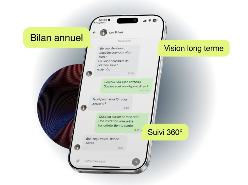 Un suivi structuré, renforcé par un accès direct à votre conseiller via notre chat privé, vous garantit des réponses rapides sans attendre le prochain rendez-vous.